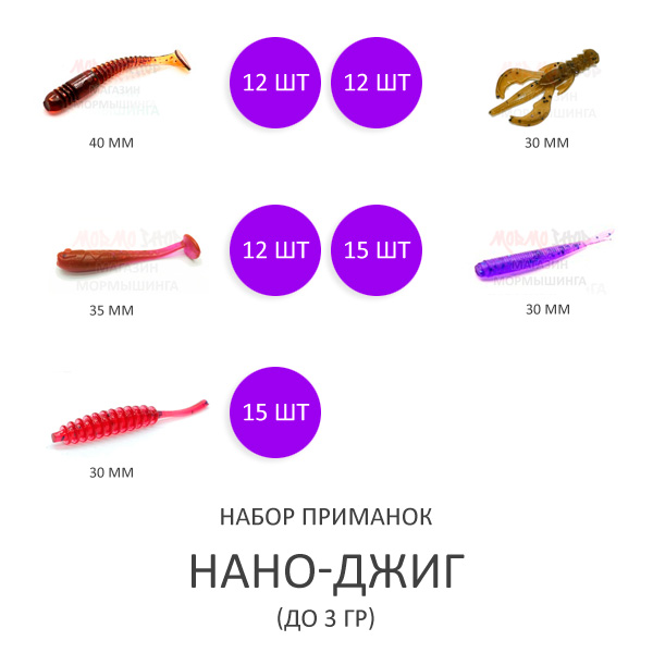 Готовый набор самых популярных форм и цветов приманок для нано-джига. Рекомендован до 3 гр.