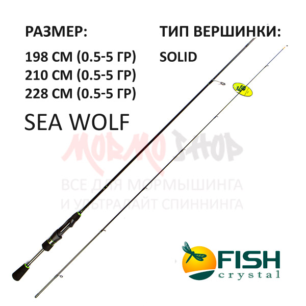 Спиннинги SEA WOLF представлены в трёх размерах: 198 см, 210 см и 228 см, с тестом от 0,5 до 5 граммов. Ключевая особенность этой серии — встроенная вершинка из твёрдого хлыста (solid), которая обеспечивает отличный контроль при проводке приманок. Спиннинги оснащены 8 кольцами и тюльпаном, что улучшает их загрузку при забросе и вываживании рыбы, а также повышает чувствительность. Удобный катушкодержатель дополнительно улучшает контроль над приманкой. Модели этой серии позволяют делать дальние и точные забросы во всём тестовом диапазоне и подходят как для микроджиговой ловли, так и для рыбалки с берега в море (рок фишинг).